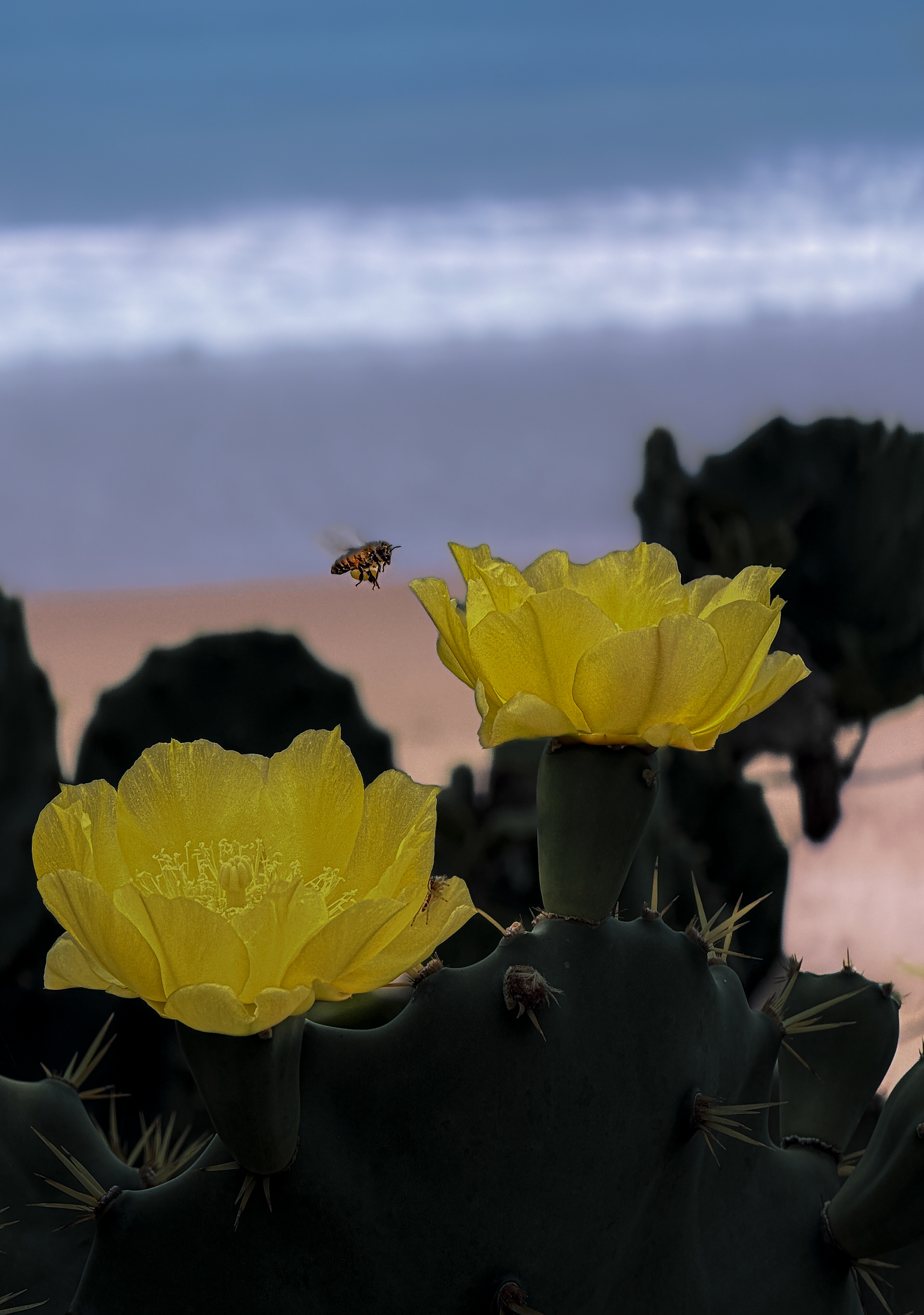 On a gray day, when the light turns diffuse and the world feels suspended, the labor of the bees persists, indifferent to the weight of the sky. Between thorns and fragile petals, life insists upon its small, unspectacular gestures. It celebrates nothing, laments nothing; it simply continues.